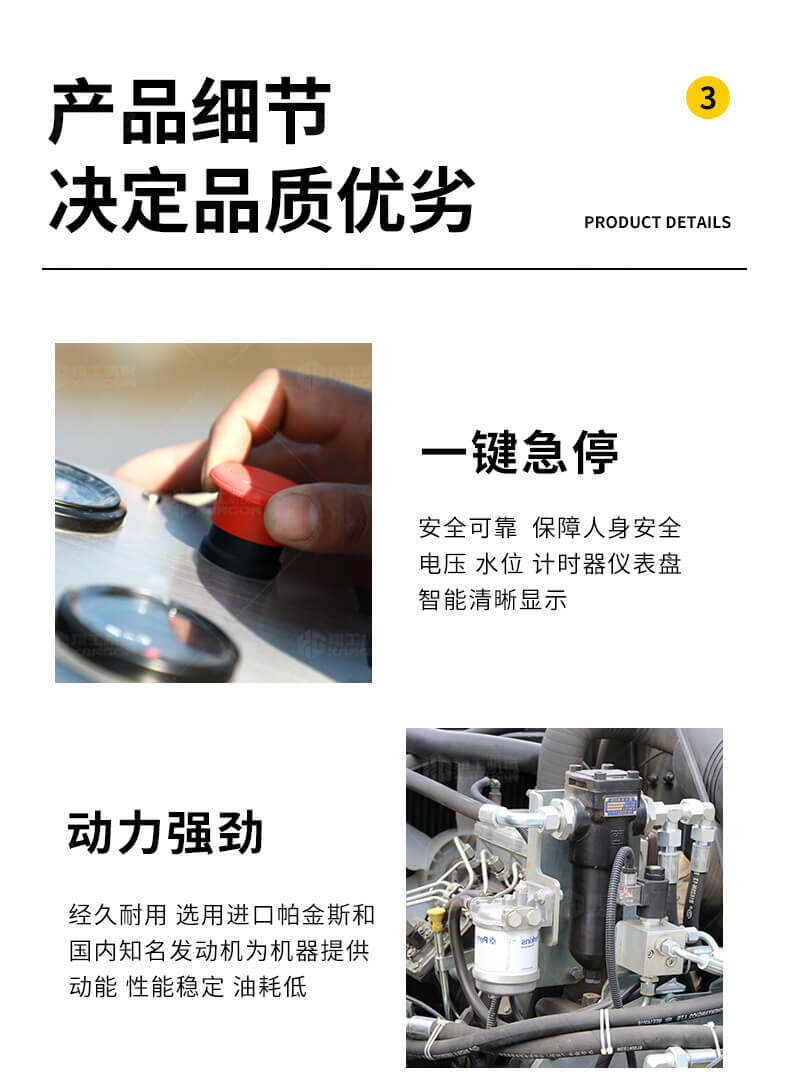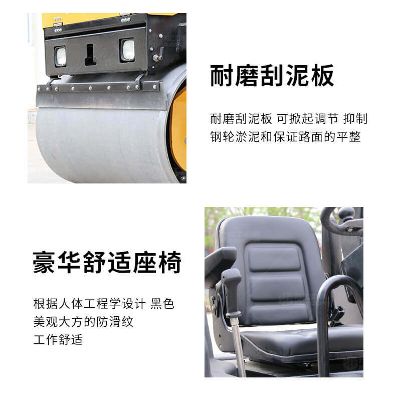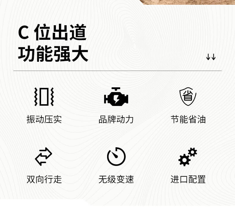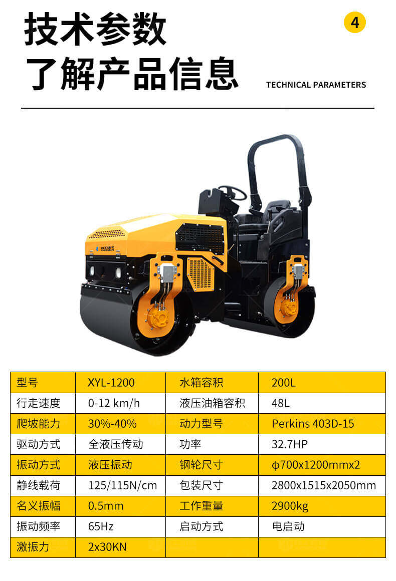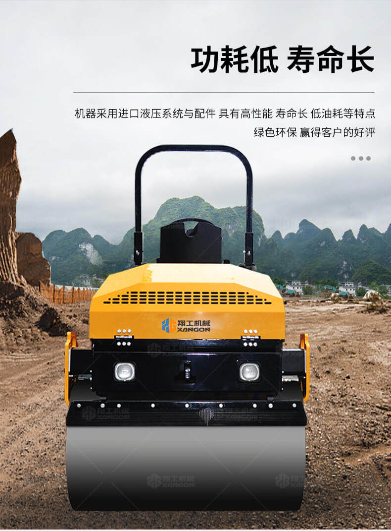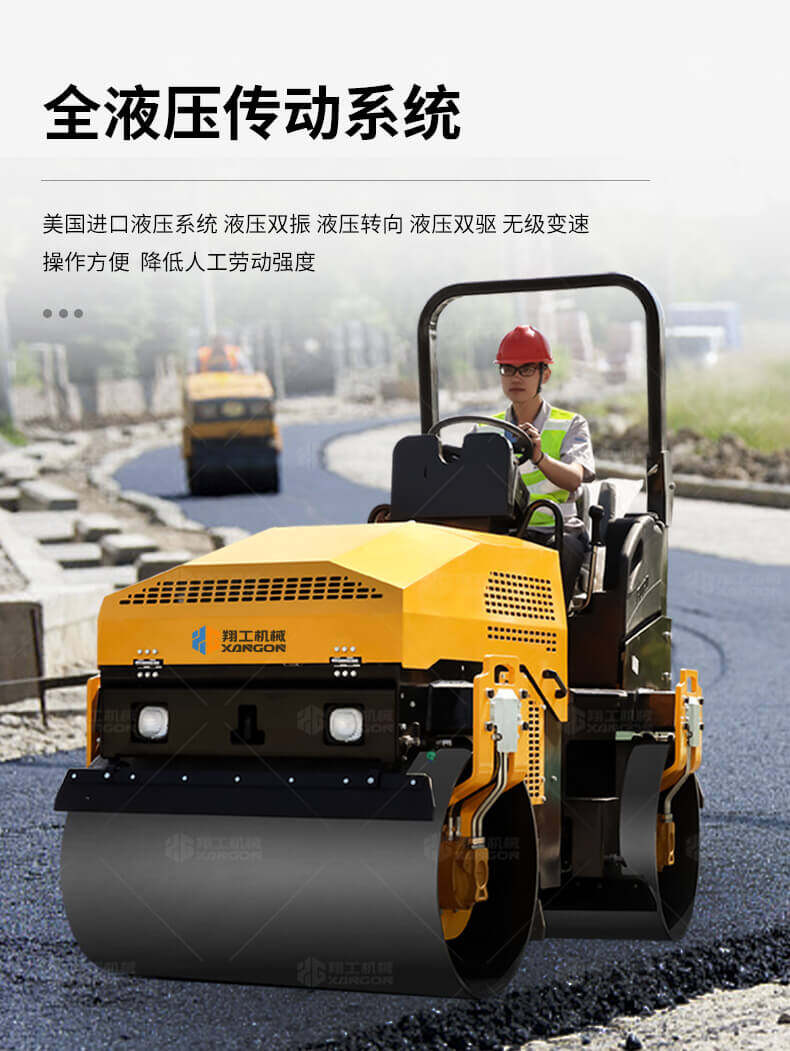 采用進口液壓系統,雙驅雙振,前后輪可單獨調節振動,亦可同時振動。液壓轉向,液壓驅動,液壓行走,液壓振動。進口英國鉑金斯柴油機三缸水冷四沖程,動力強勁,性能穩定。超快速度一小時可達12千米,無極變速。壓土,碎石,壓瀝青,壓回填土效果超乎想象。