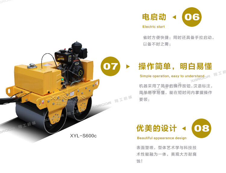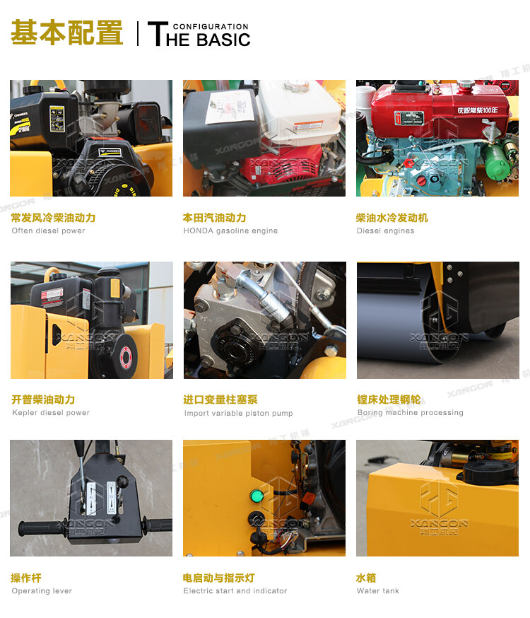 ·柴油動力采用電啟動,輕便靈活換向機構(gòu);雙驅(qū)雙振,保證了整體的壓實和爬坡能力;