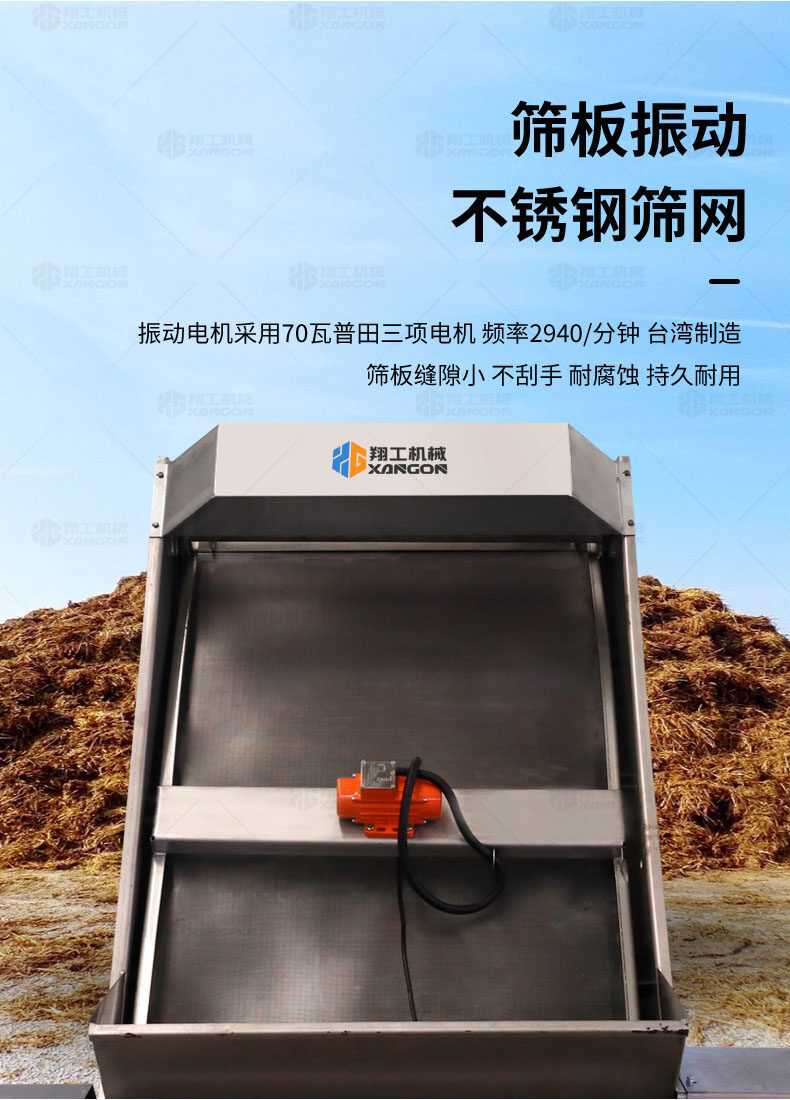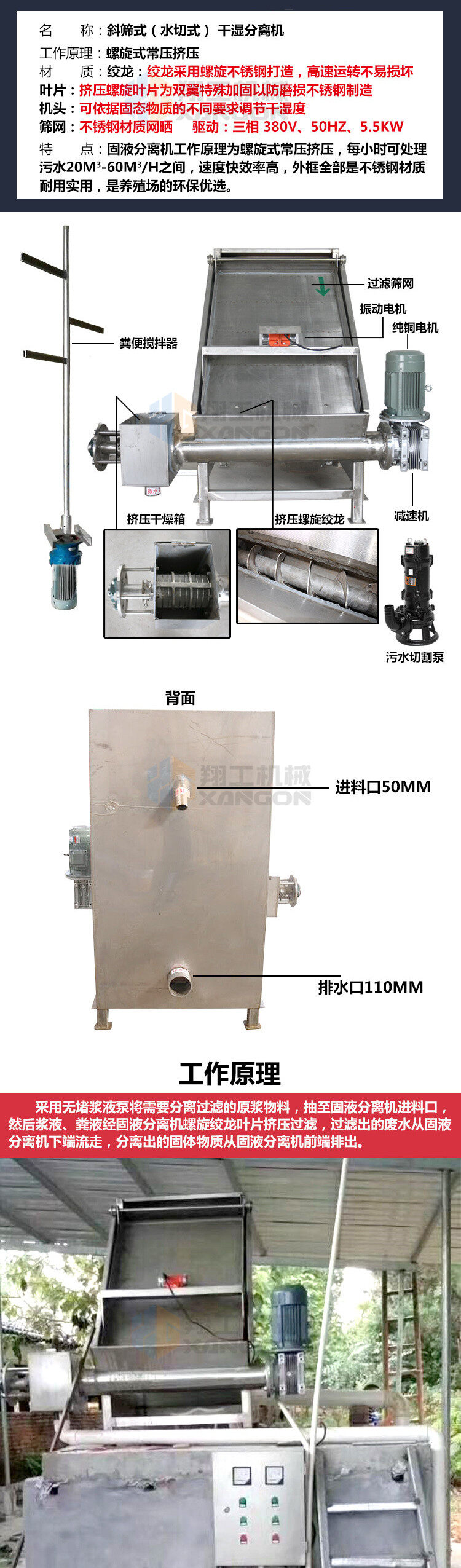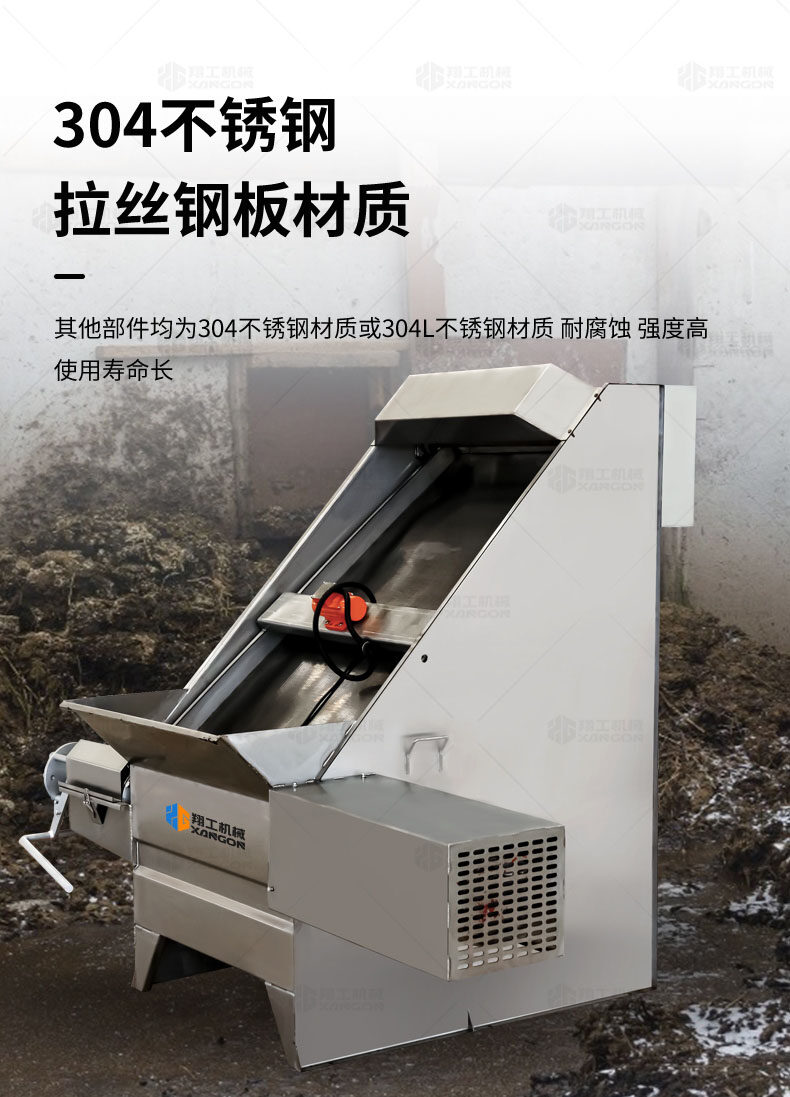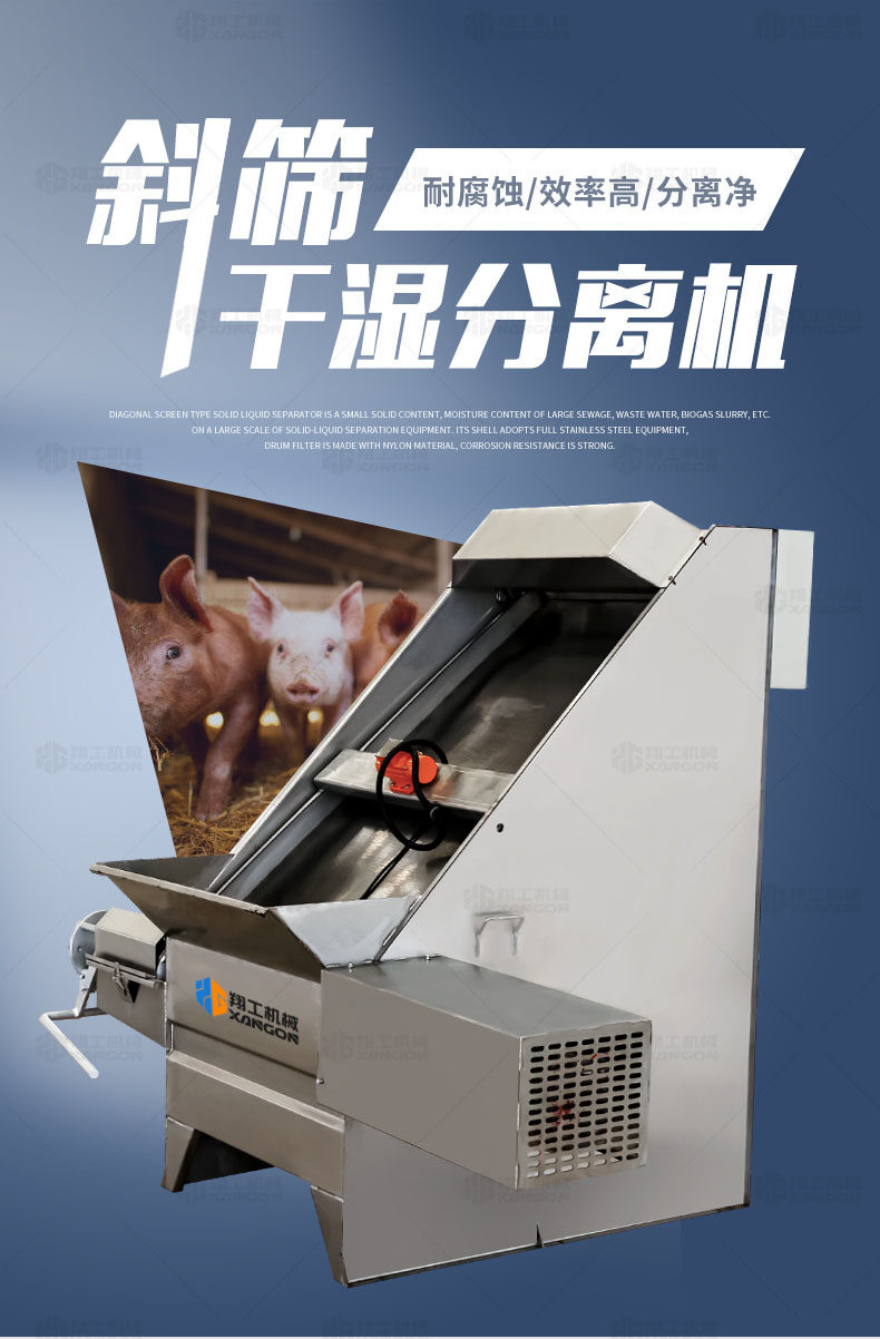 斜篩式固液分離機是一款針對含固率較小,含水率較大的污水、糞水、沼液等進行大規模固液分離的設備。其設備外殼采用全不銹鋼打造,圓筒濾網則采用尼龍材質制成——耐腐蝕性強。