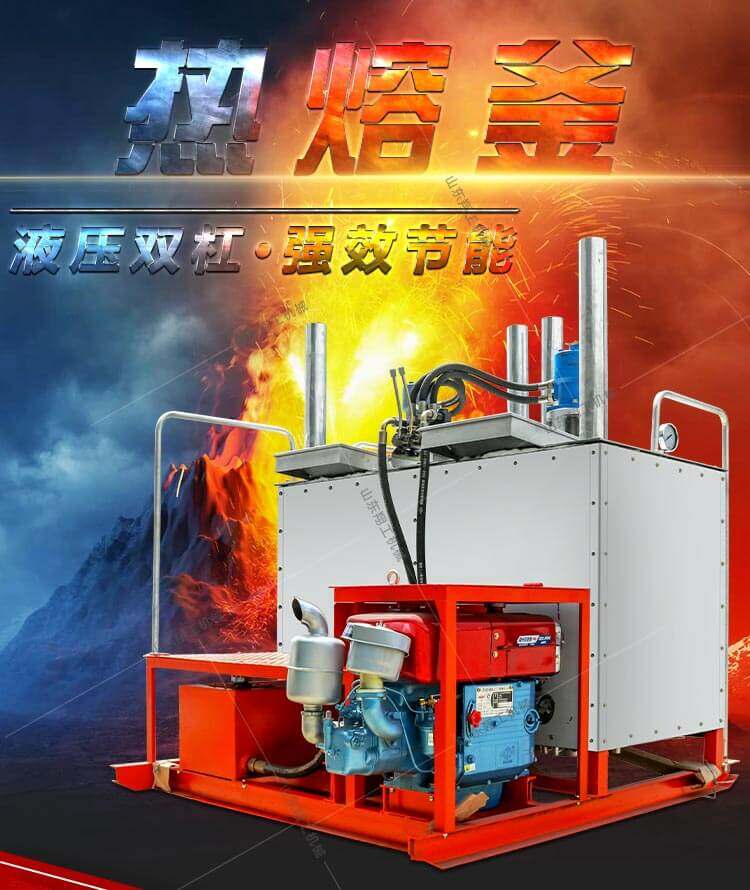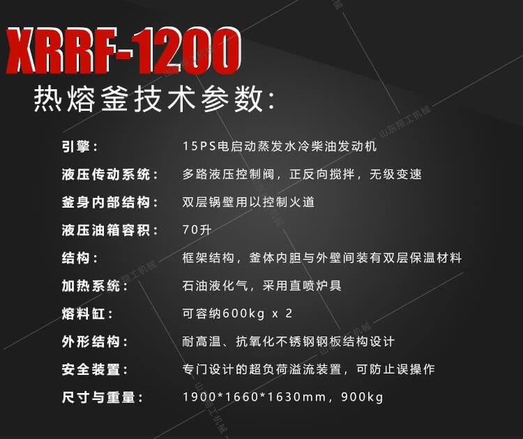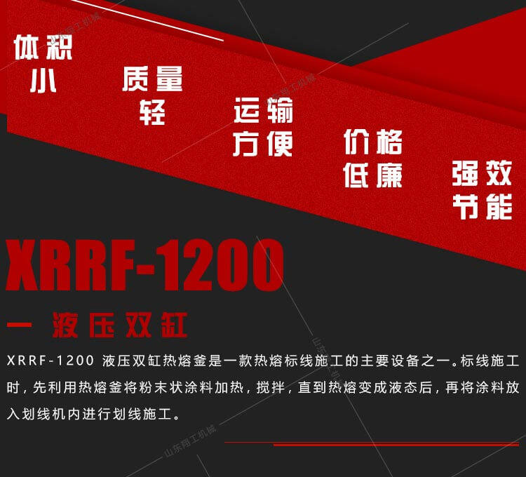 XG1200液壓雙缸熱熔釜是一款熱熔標線施工的主要設備之一。標線施工時,先利用熱熔釜將粉末狀涂料加熱,攪拌,直到熱熔變成液態后,再將涂料放入劃線機內進行劃線施工。由于涂料的融化質量直接關系到標線質量,因此熱熔釜是熱熔標線設備的關鍵部件,是涂料的融化必不可少的部分。