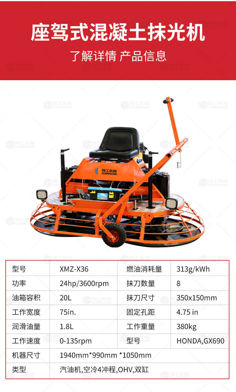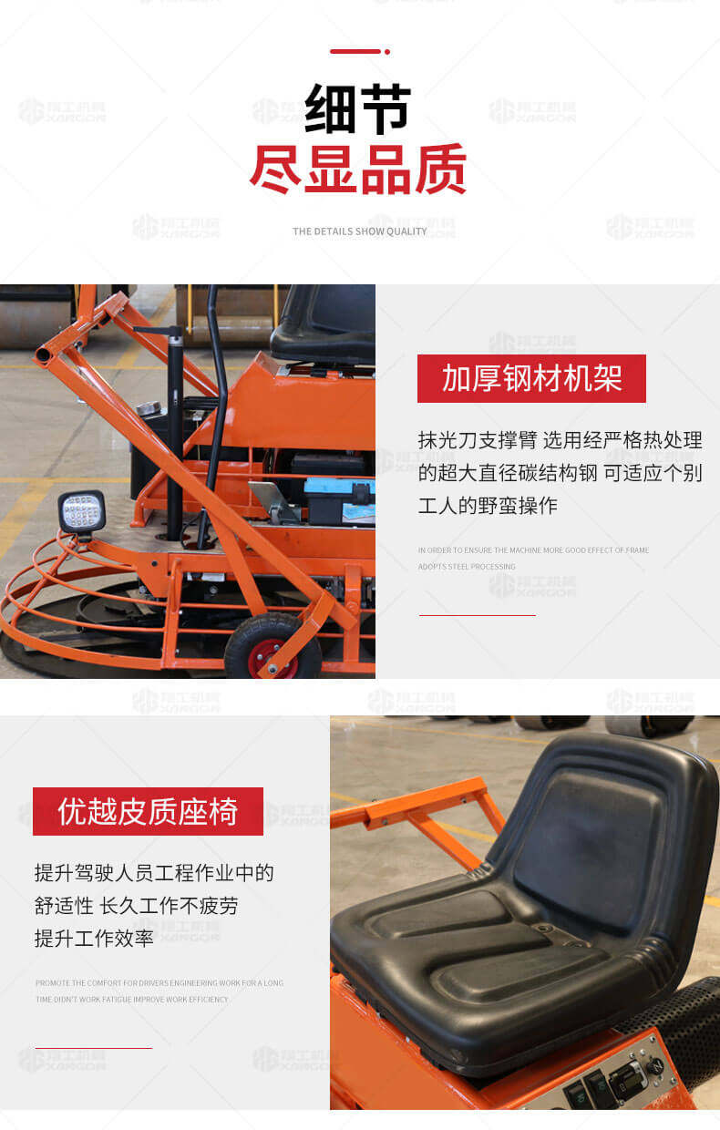 座駕式混凝土抹光機?用于混凝土地面的提漿、壓實、抹平、抹光,相對于手扶式抹光機,效率高。