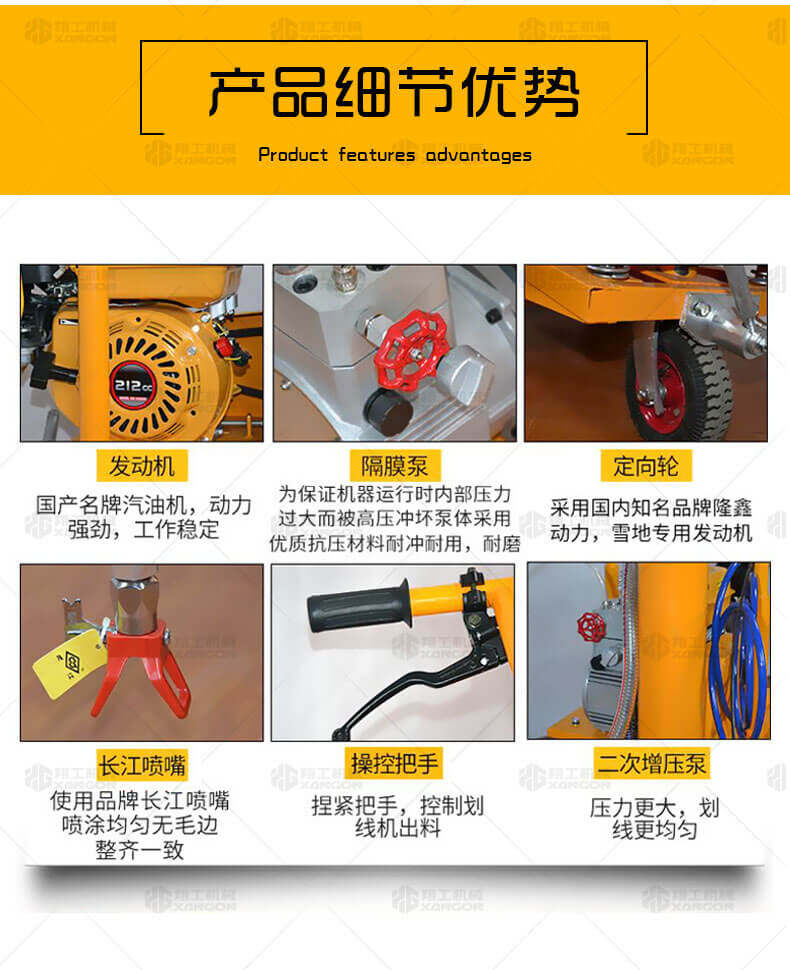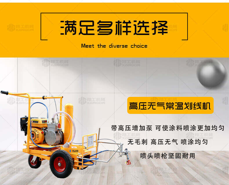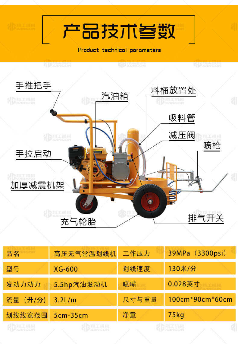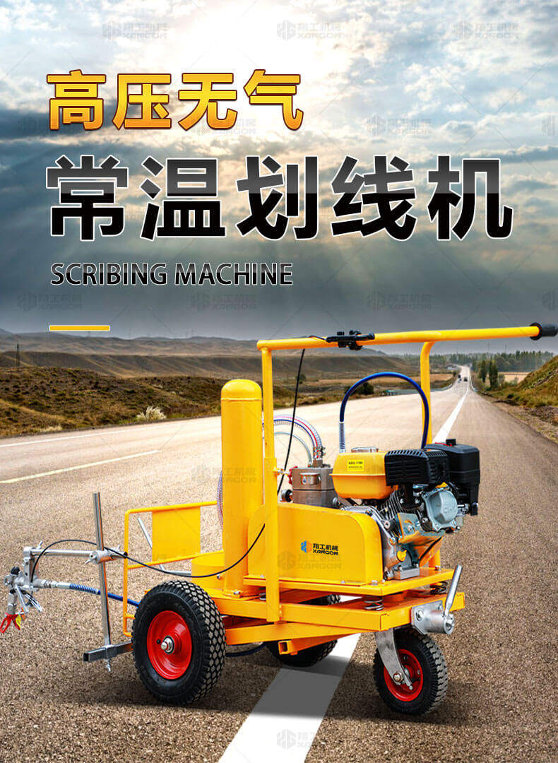 高壓無氣常溫劃線機(jī)利用汽油機(jī)驅(qū)動(dòng)單注塞泵,使涂料在機(jī)內(nèi)形成高壓進(jìn)行噴涂,索劃線厚薄均勻邊角齊,噴槍架導(dǎo)向桿升降設(shè)計(jì),調(diào)節(jié)噴涂寬度更為準(zhǔn)確方便。該機(jī)器是常溫標(biāo)線施工的專用設(shè)備,主要用于公路、停車場、機(jī)場、加油站、公司廠區(qū)等涂畫直線、虛線、曲線、斑馬線、文字、箭頭、圖形、標(biāo)志等。