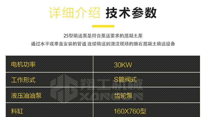 產品描述 25型二次構造柱專用輸送泵是一種復合泵送要求的混凝土泵,通過水平或垂直安裝的管道,連續輸送到澆注現場的細石混凝土輸送設備。