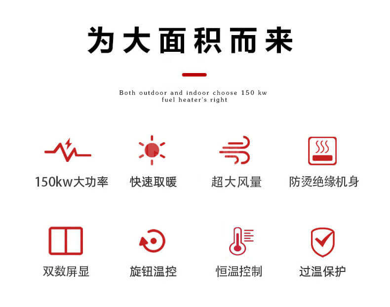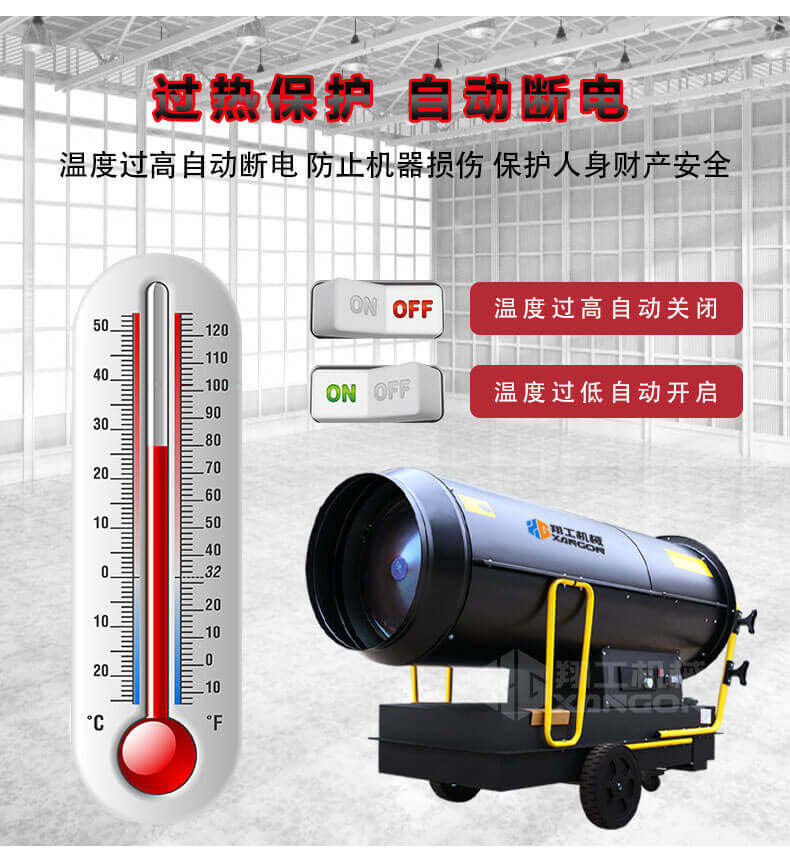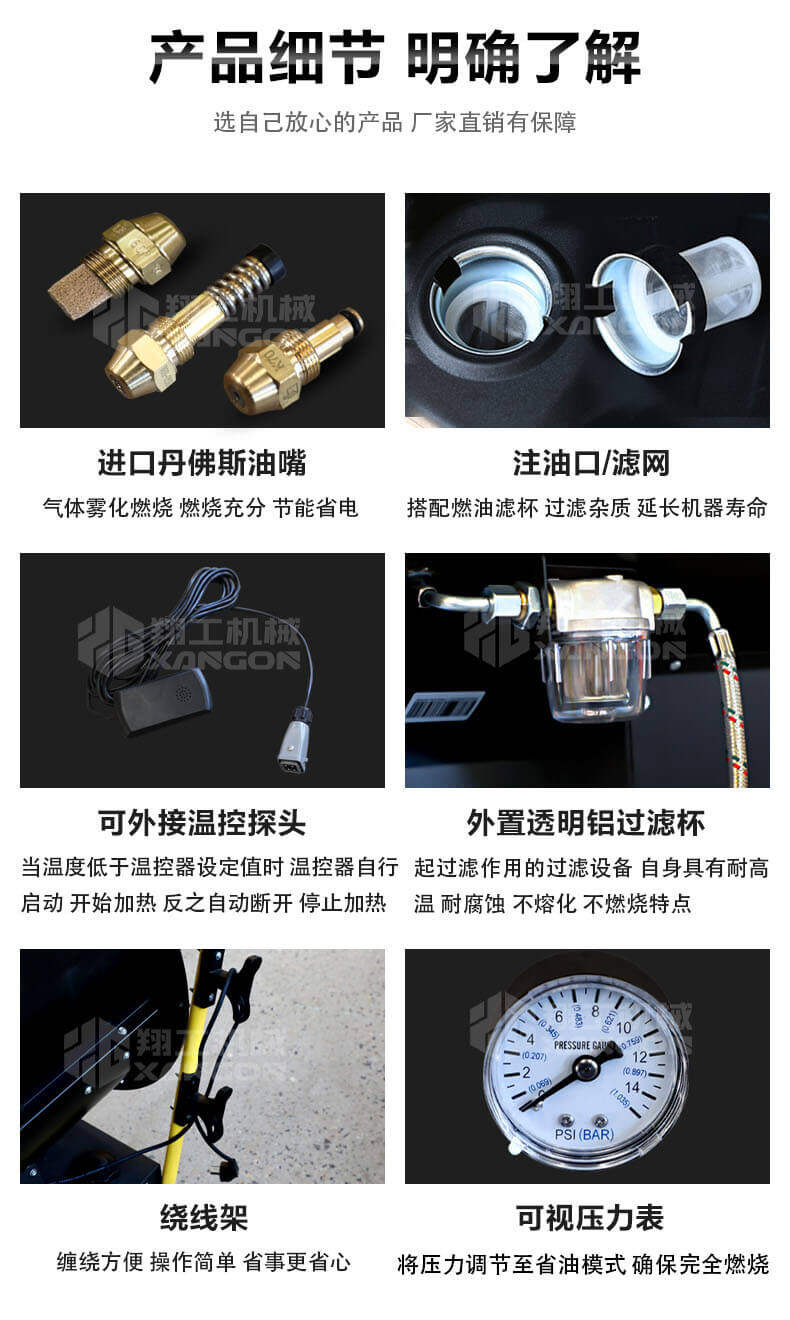 1,超大功率大油箱工程方案機,120L超大容量油箱,續航可達10小時以上。 2.雙顯,廷時功能,斷電記憶功能,可外接溫控 3.旋鈕調溫 4.風量大,送風距離遠 5.外置適明鋁過滅杯。