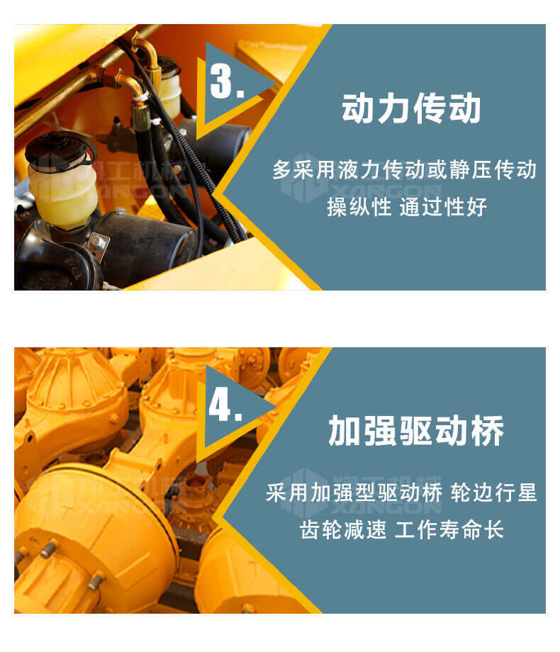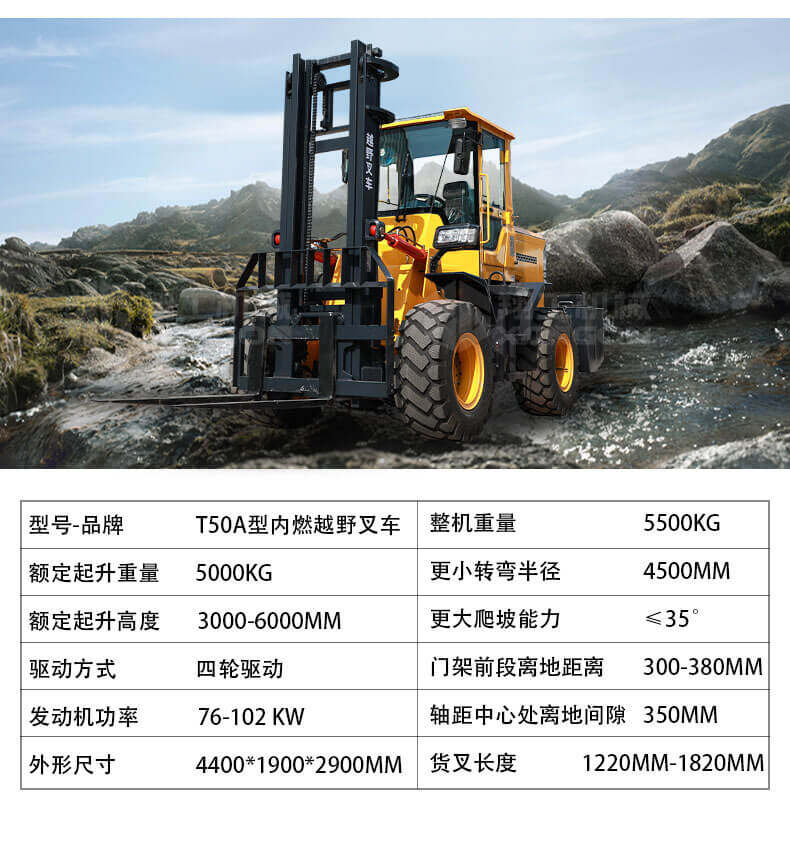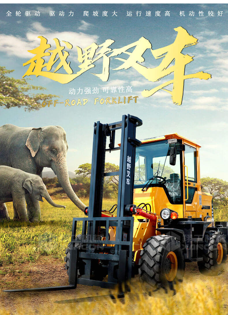 5.越野叉車發(fā)動(dòng)機(jī)功率大,采用全輪驅(qū)動(dòng)和越野輪胎。
