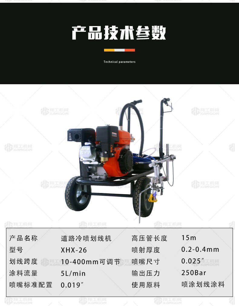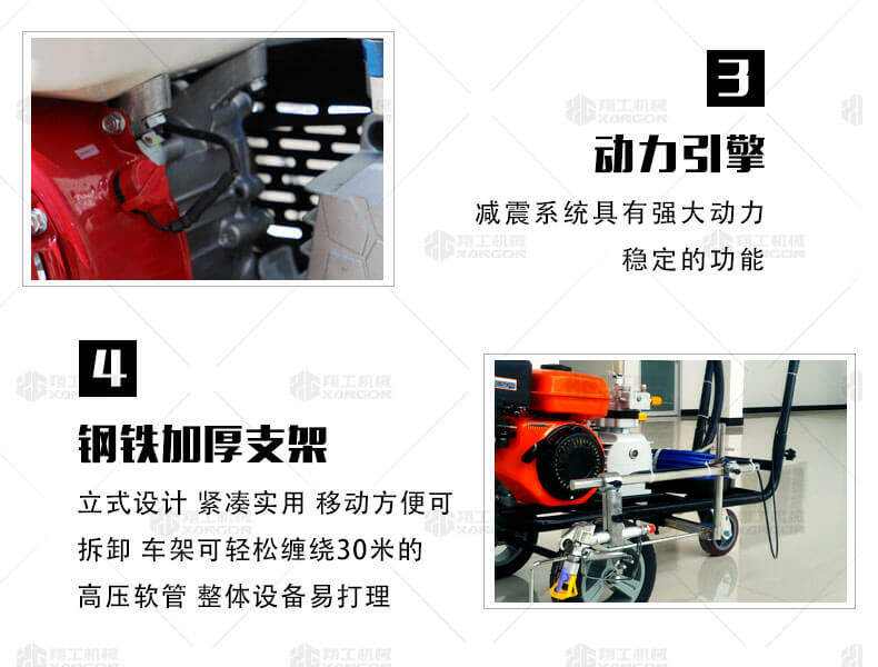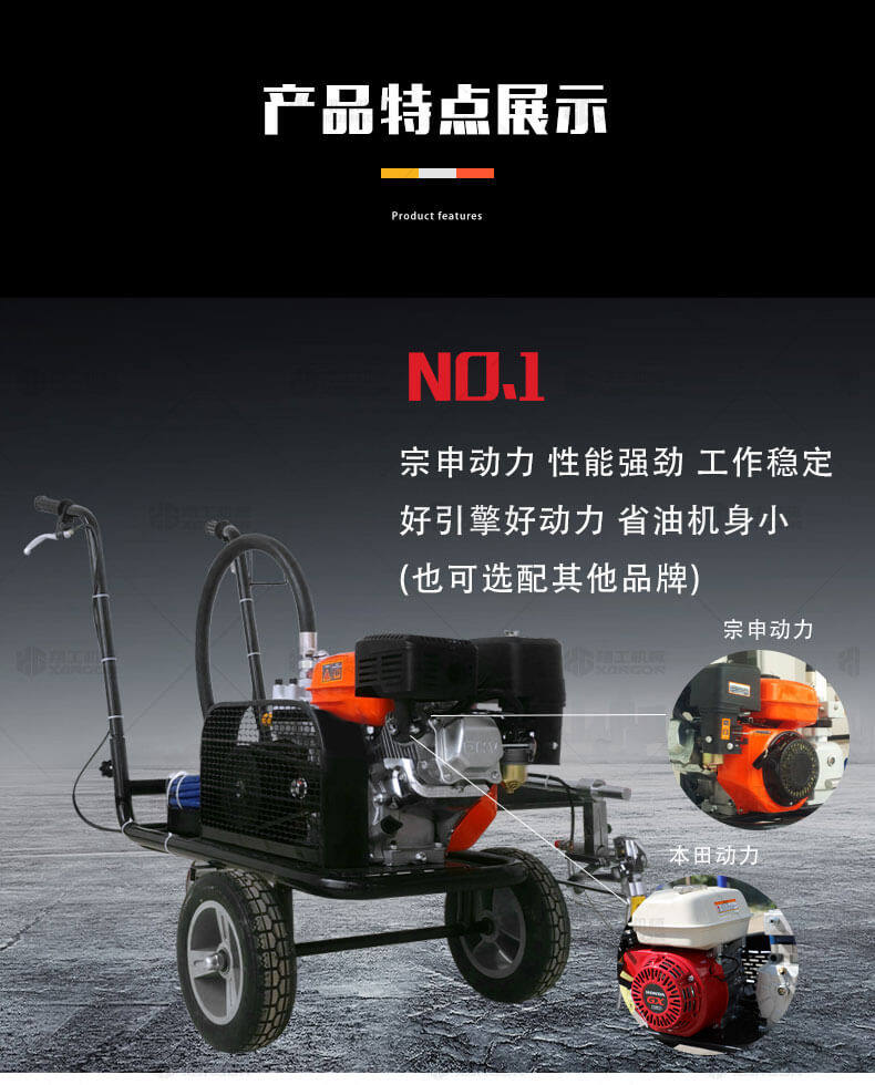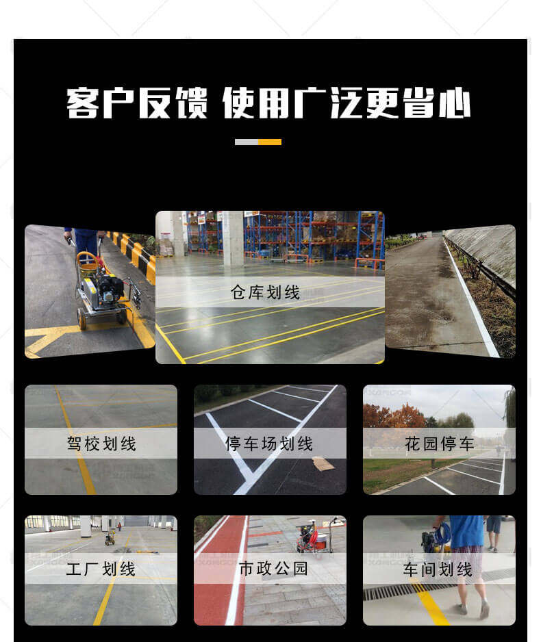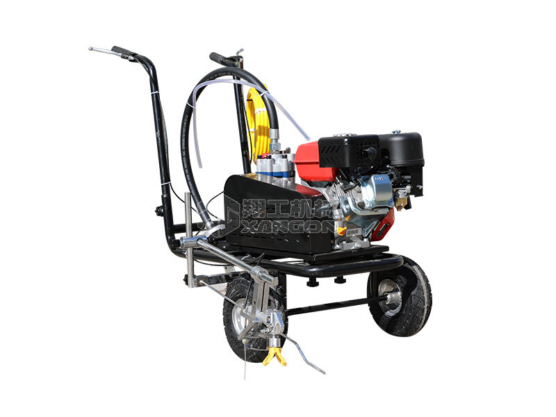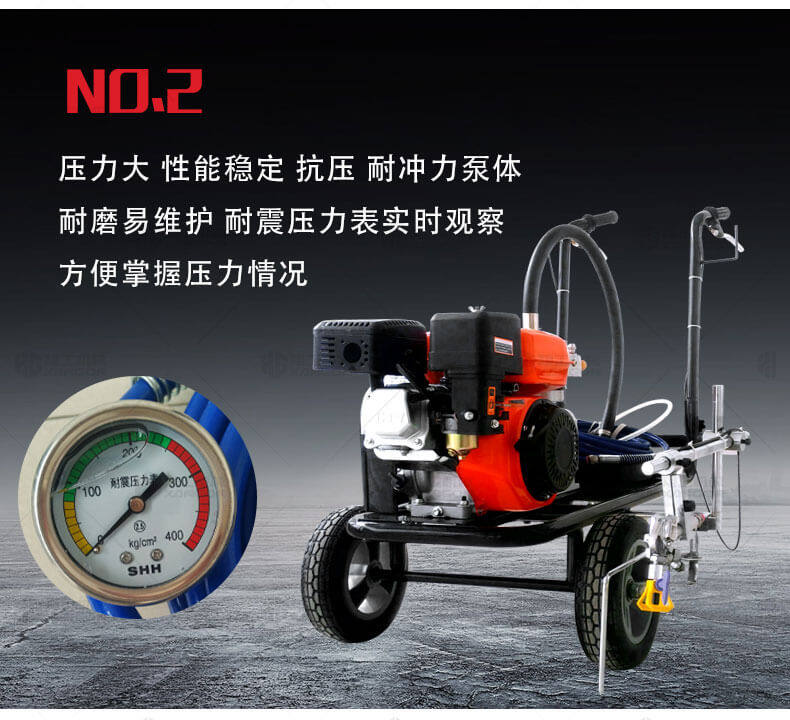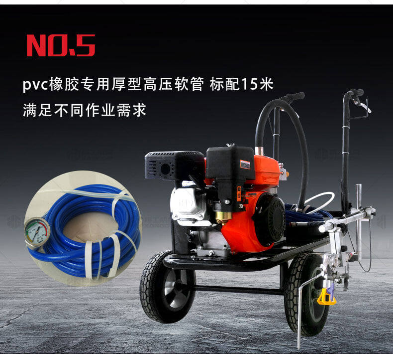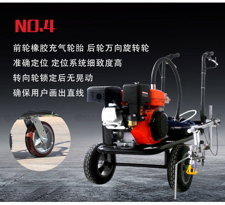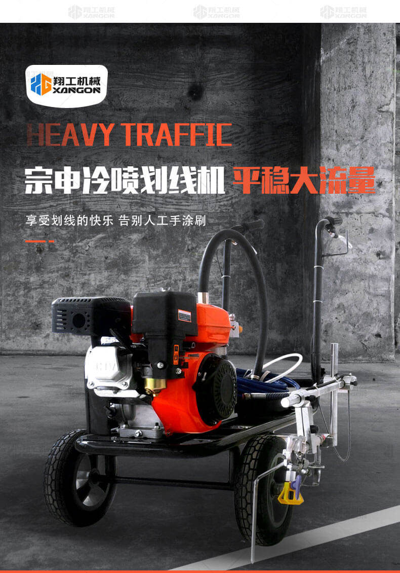 冷噴劃線機用汽油機帶動高壓泵的無氣噴涂技術運用于運動場地劃線車,噴出的線型清晰、流暢、飽滿、均勻、工作效率高。