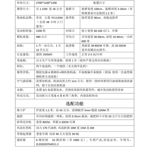 選配:推土鏟、施肥器、打藥機、碎草機等