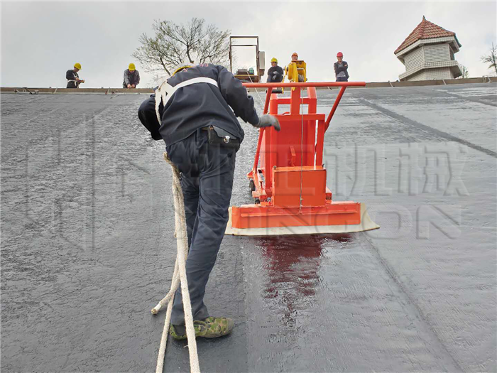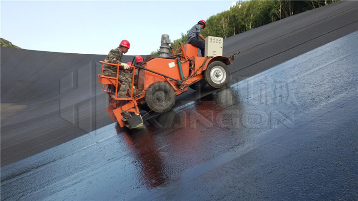 瀝青封閉層的施工采用適合于斜坡施工的專用瀝青瑪蹄脂涂刷機,在牽引臺車的牽引下沿著面板從下往上涂刷。涂刷完一個條帶后,將涂刷機移動至下一個條帶繼續涂刷。瑪蹄脂封閉層涂刷作業時環境氣溫應在10℃以上,涂刷溫度一般在170℃~190℃;施工完成的封閉層表面禁止無關人員和機械行走;特殊部位:壩頂及曲率半徑較小的圓弧斷,采用小型機械涂刷方式進行機械涂刷進行,環庫水平段及弧段全部采用小刮涂機配合人工進行刮涂施工。
