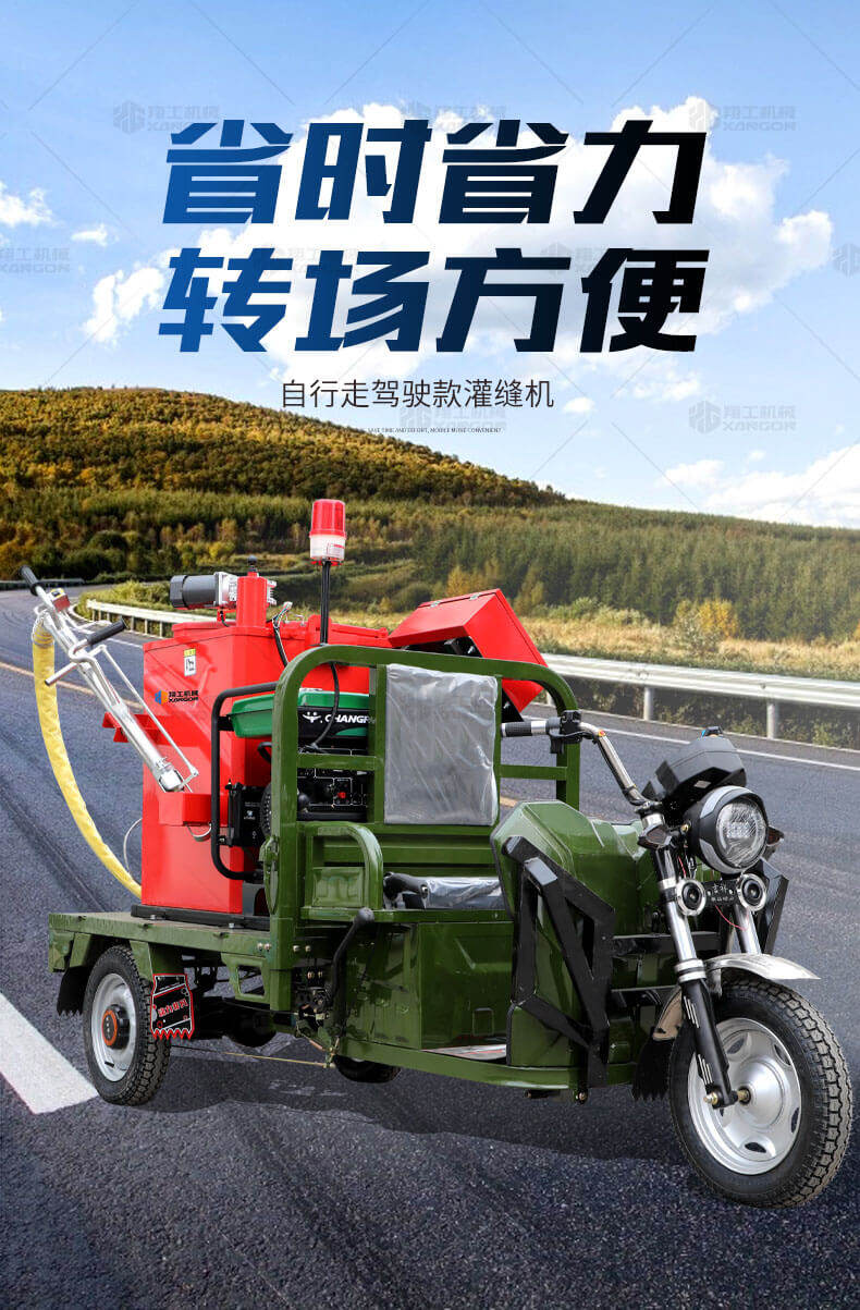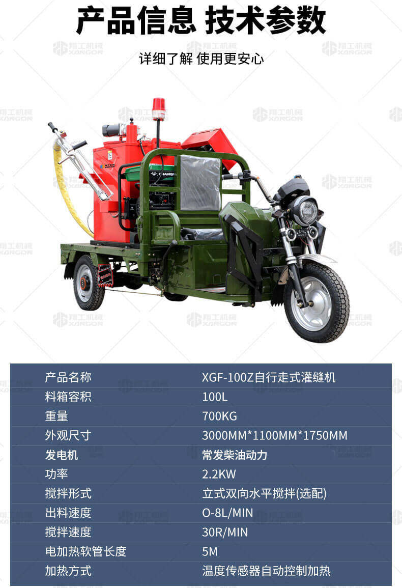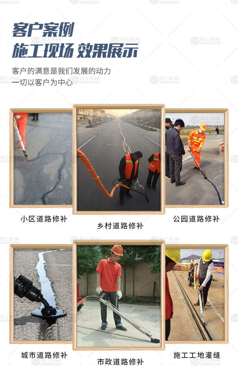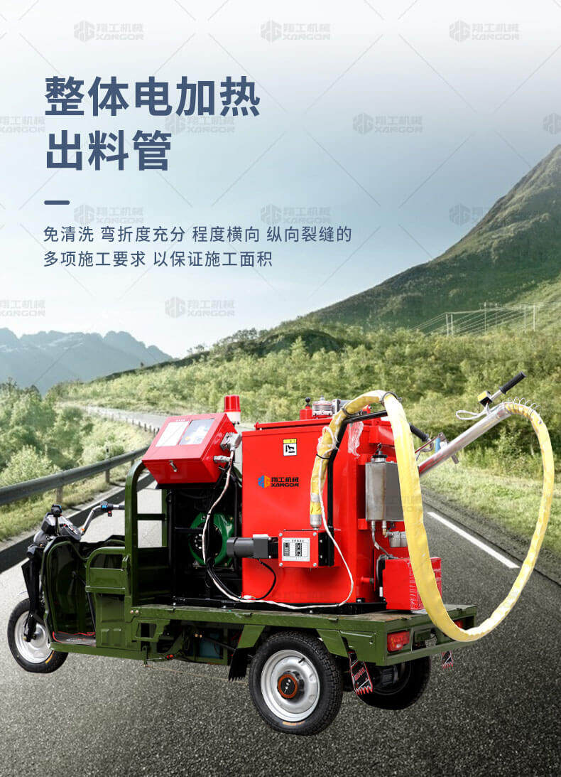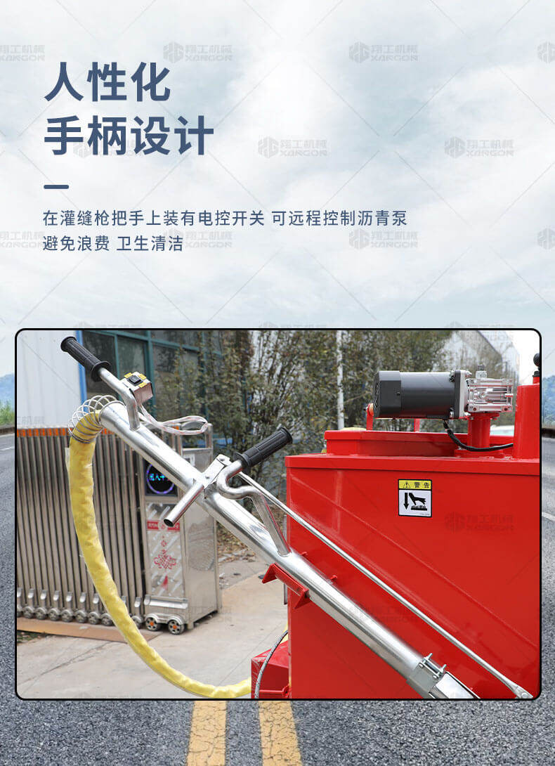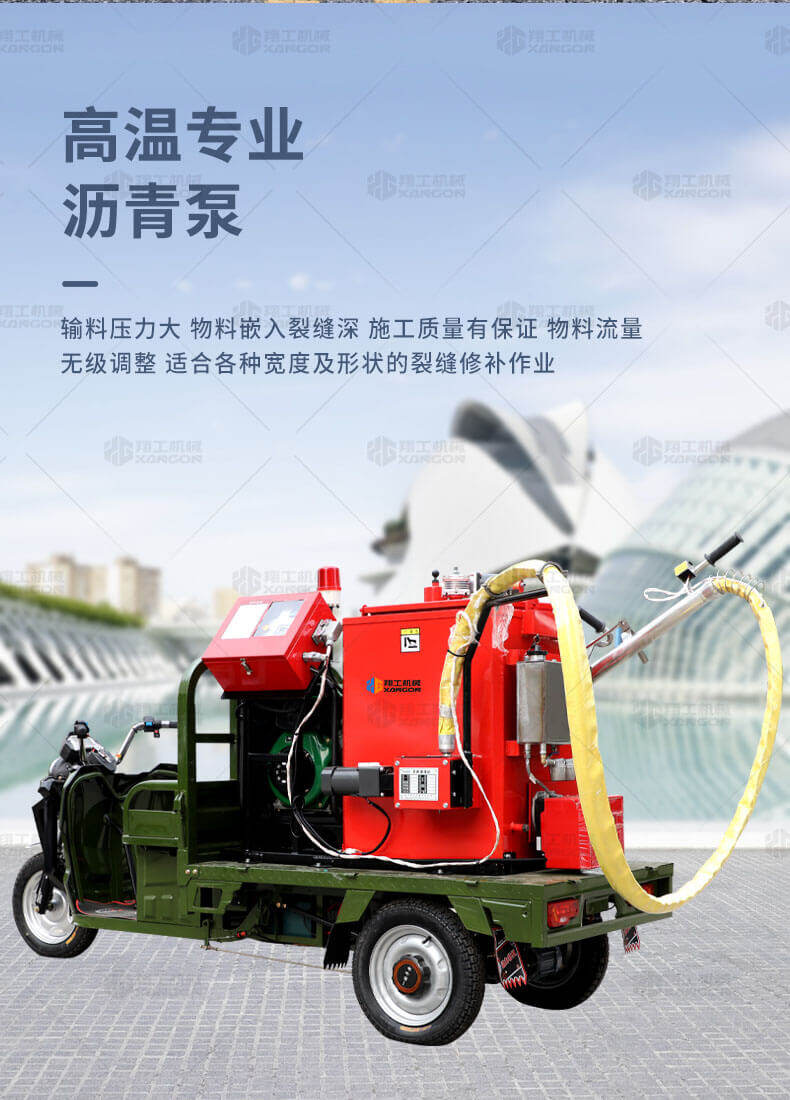 主要用于瀝青或水泥路面裂縫瀝青灌縫。汽油灌縫機主要有手推式和自行式手持灌縫管操作,采用進口柴油燃燒器加熱。在工作時首先在料箱內加入瀝青或灌縫膠,啟動發電機供電,依次間斷打開導熱油泵開關,燃燒器開關,出料管加熱開關;調整自動溫控系統與材料的溫度相同,通過柴油燃燒器自動加熱熔料箱內導熱油開始升溫(拖式為強制循環)使材料融化,溫度是通過自控系統來控制。溶料時間大約30-40分鐘左右。在材料融化、出料管溫度達到后可以進行工作。手持灌縫管對正裂縫灌縫處理。瀝青泵的出料流量可調。在工作過程中隨時添加材料保證工作的連續性。