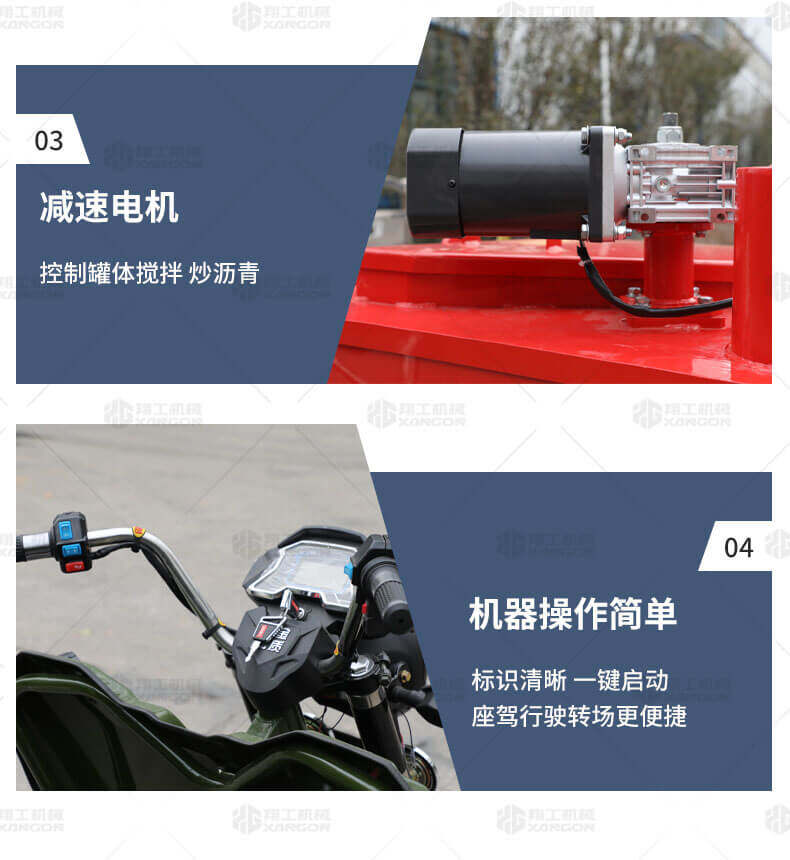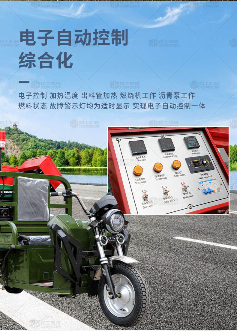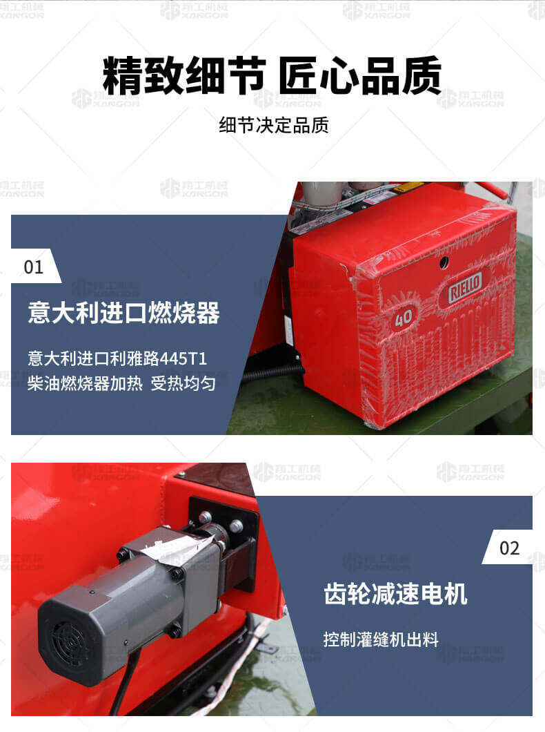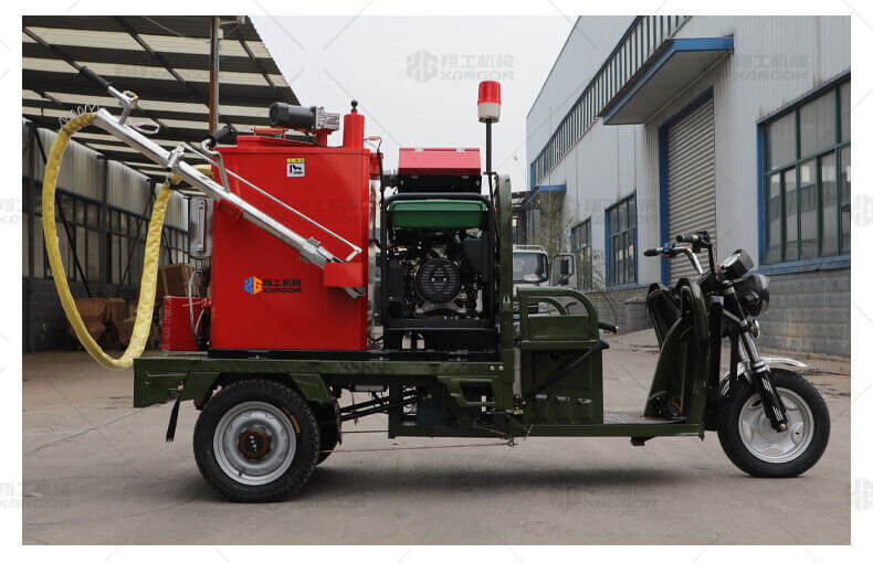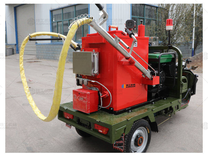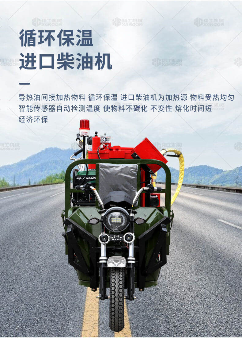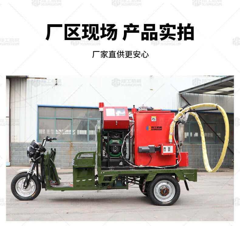 主要用于瀝青或水泥路面裂縫瀝青灌縫。汽油灌縫機主要有手推式和自行式手持灌縫管操作,采用進口柴油燃燒器加熱。在工作時首先在料箱內加入瀝青或灌縫膠,啟動發電機供電,依次間斷打開導熱油泵開關,燃燒器開關,出料管加熱開關;調整自動溫控系統與材料的溫度相同,通過柴油燃燒器自動加熱熔料箱內導熱油開始升溫(拖式為強制循環)使材料融化,溫度是通過自控系統來控制。溶料時間大約30-40分鐘左右。在材料融化、出料管溫度達到后可以進行工作。手持灌縫管對正裂縫灌縫處理。瀝青泵的出料流量可調。在工作過程中隨時添加材料保證工作的連續性。