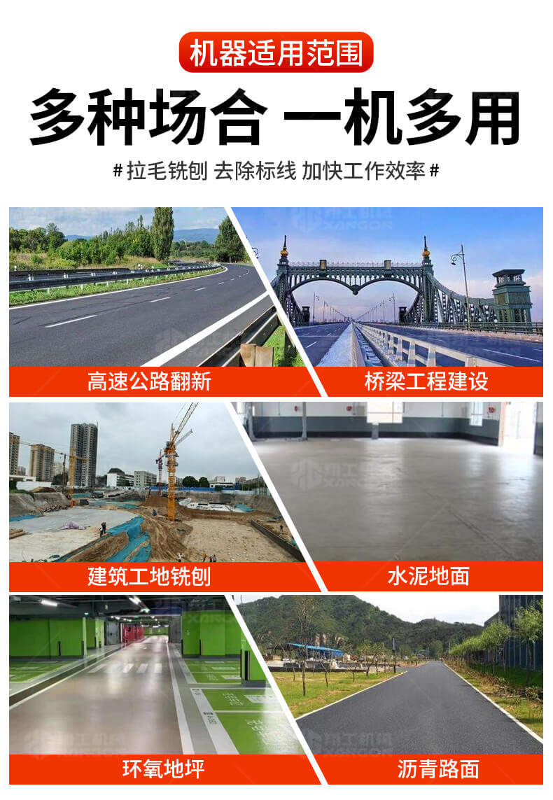 鑿毛銑刨機多種場合一機多用,拉毛銑刨去除標線加快工作效率.