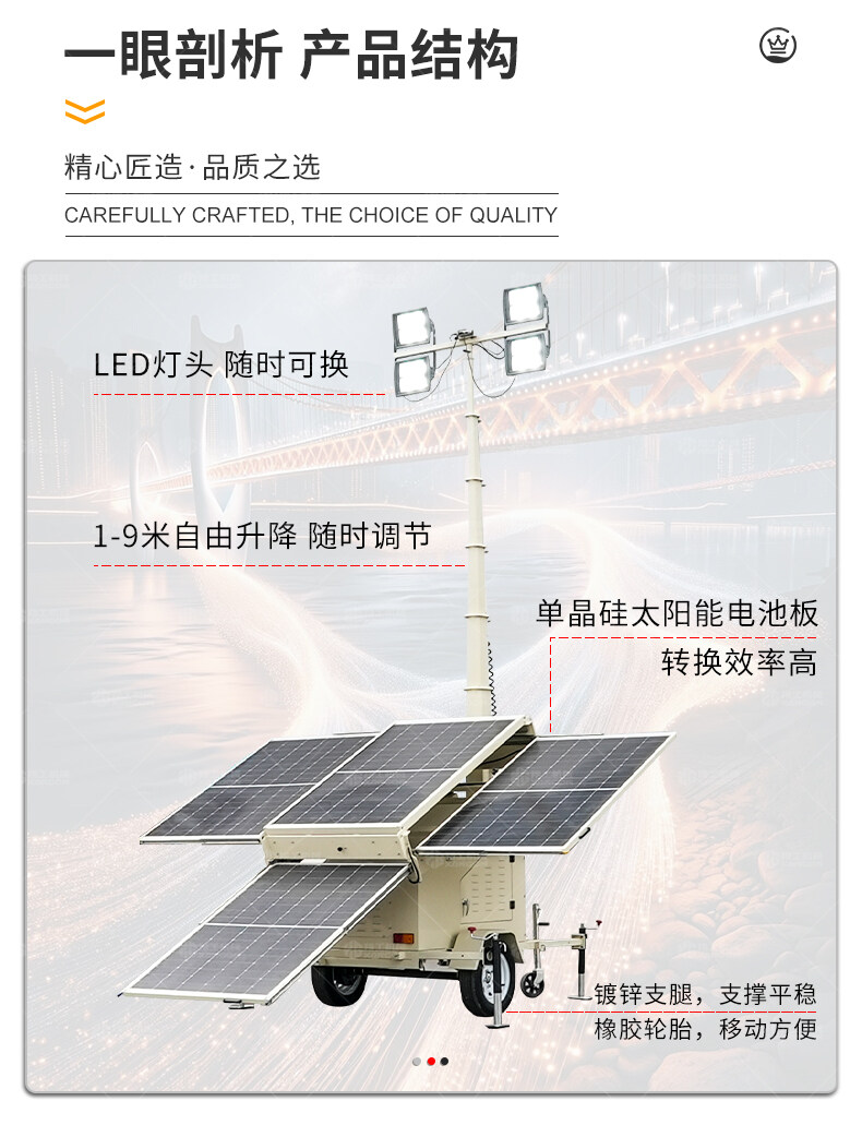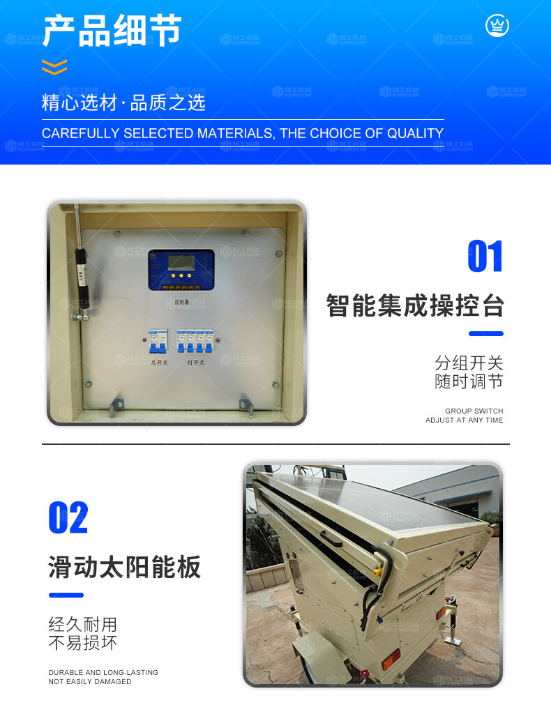 太陽能燈車采用高效光伏板與鋰電池組合,白天蓄電,夜間自動照明,節能環保。配備高亮度LED燈,照射范圍廣,適用于道路施工、應急搶險、夜間作業等場景。移動靈活,防水防塵,無需外接電源,續航持久。結構堅固,操作簡便,是戶外臨時照明的理想選擇,兼顧經濟性與實用性。